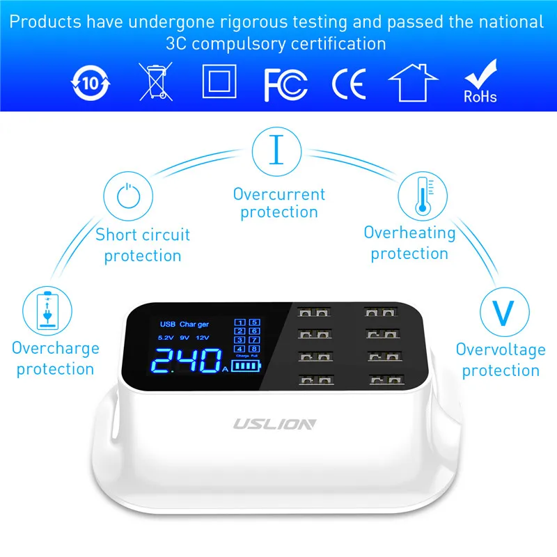 USLION 8 Port USB Charger HUB Quick Charge 3.0 LED Display Multi USB Charging Station Mobile Phone Desktop Wall Home EU Plug